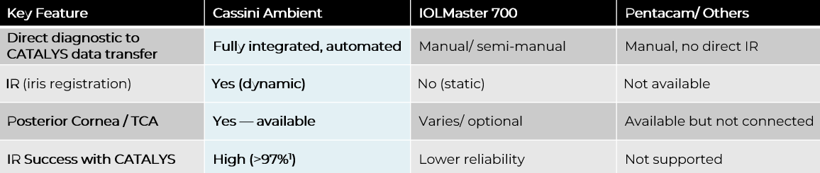 Cassini Connect OR integrates diagnostics, planning, and intraoperative alignment into a single connected workflow, with Cassini Ambient as the core diagnostic product. This comparison highlights how Cassini Ambient differs from competitors’ diagnostic systems in preoperative assessment and integration with CATALYS for alignment.