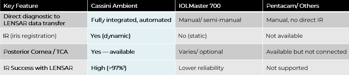 Cassini Connect OR integrates diagnostics, planning, and intraoperative alignment into a single connected workflow, with Cassini Ambient as the core diagnostic product. This comparison highlights how Cassini Ambient differs from competitors’ diagnostic systems in preoperative assessment and integration with LENSAR for alignment.